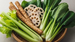 ゴボウ、レンコン、セロリ、小松菜など。
