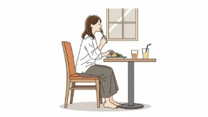 しっかりと足の裏を床につけ、背筋を伸ばして食べることで、顎関節への負担を最小限にしつつ、効率よく噛むことができます。