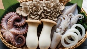 タコ、イカ(生やボイル)、エリンギ、舞茸など。